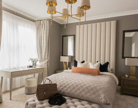 Nesenstančios klasikos stiliaus pakabinamas šviestuvas California su horizontaliomis šešiomis žalvarinėmis atšakomis, kurių galuose vertikaliais žalvariniais vamzdeliais pritvirtinti tekstiliniai nupjauto kūgio formos gaubtai. Gaubtai gali būti juodos ar kreminės spalvos, vidinė pusė - auksinis lakas.