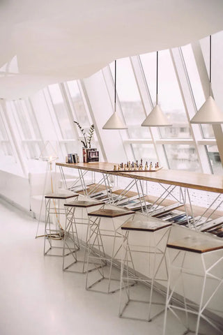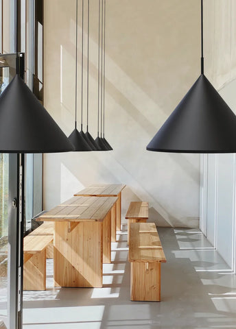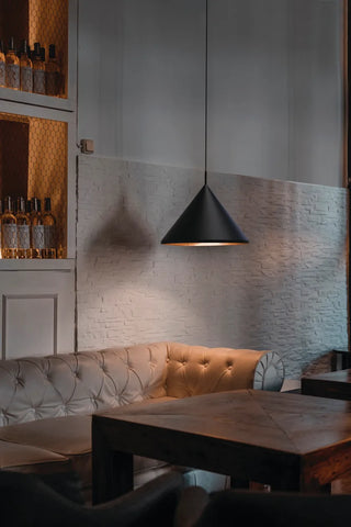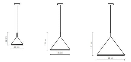 Pakabinamas šviestuvas su klasikiniu kūgio formos metaliniu gaubtu. Yra trijų dydžių (22, 35 ir 50 cm diametro) juodos ir baltos spalvos.