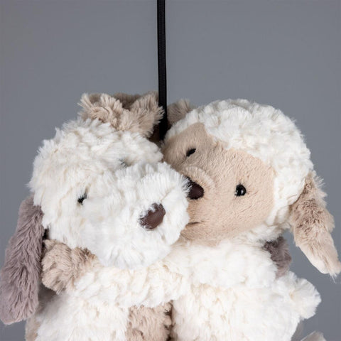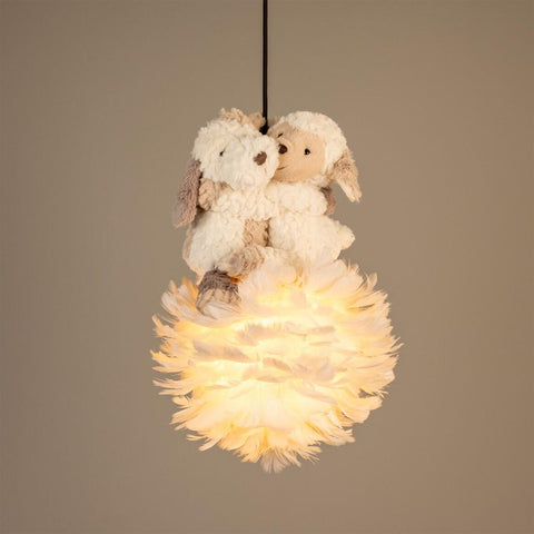 Pakabinamas šviestuvas Foz Teddy Cloud - su lengvu plunksnų gaubtu ir dviem mielais pliušiniais gyvūnėliais - avyte ir šuniuku. Įžiebtas gaubtas skleidžia švelnų švytėjimą, suteikia tekstūros bei žavesio. Šis šviestuvas sukurtas teikti džiaugsmą, derina funkcionalumą su vaikų vaizduote. Puikiai tinka vaikų kambariuose