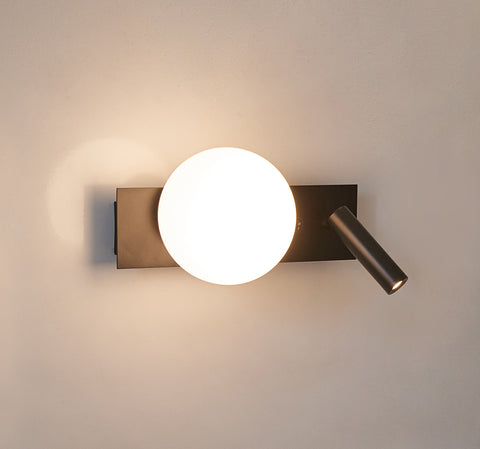 Sieninis šviestuvas, susidedantis iš dviejų šviesos šaltinių. Vienas su išraiškingu opalo stiklo baltos spalvos gaubtu ir juodos spalvos metalinėmis detalėmis, kitas - juodos spalvos kryptinis šviestuvėlis. Idealus variantas, mėgstantiems skaityti ar užsiimti rankdarbiais.